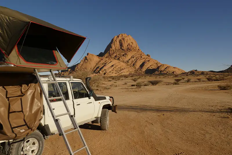 Nach einer guten Nacht im Dachzelt und einem leckeren Frühstück beginnt unser Off-Road-Abenteuer durch das entfernte Damaraland. Wir fahren in einem Konvoi Richtung Brandberg, dem höchsten Bergs Namibias. Am ersten Fahrtag werden Sie Ihr Fahrzeug auf einfachen Off-Road Strecken näher kennenlernen. Alle Fahrzeuge sind per Funkgerät miteinander verbunden, über Funk kann der Guide Ihnen Tipps und Tricks während der Fahrt vermitteln.