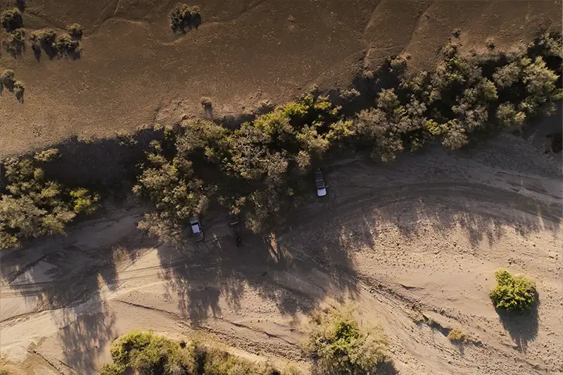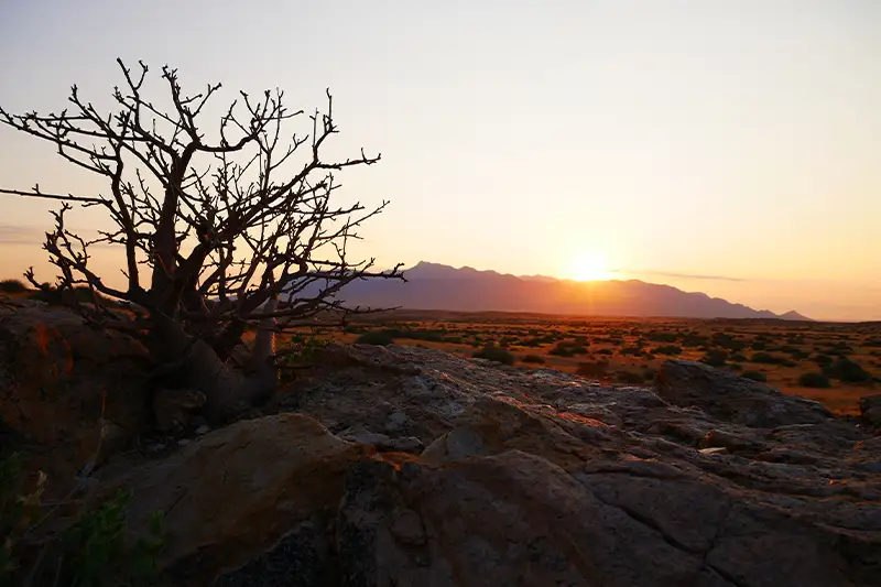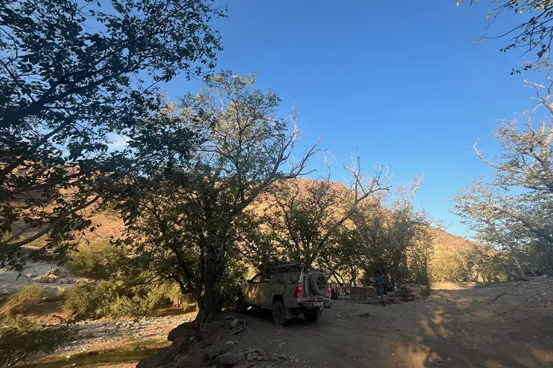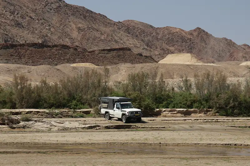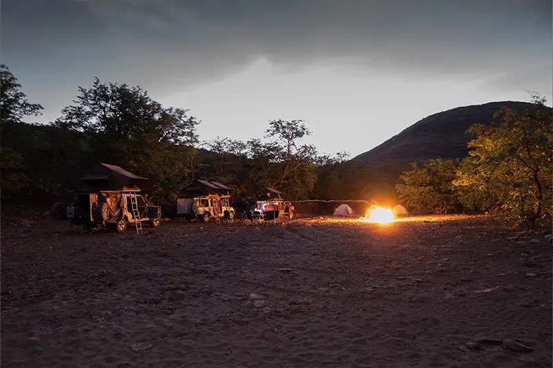 Auf einem meist steinigen Pfad setzen wir unsere Fahrt fort und erreichen schließlich den Khumib Fluss, an dem wir einige Kilometer entlang fahren werden. Unser Rastlager für die Nacht befindet sich am Trockenflusslauf des Khumib Reviers unter einem uralten Ahnenbaum. Hier können wir die Freiheit und Stille der Natur genießen und den Abend in gemütlicher Atmosphäre ausklingen lassen.