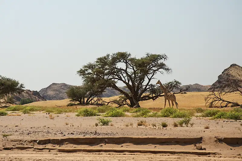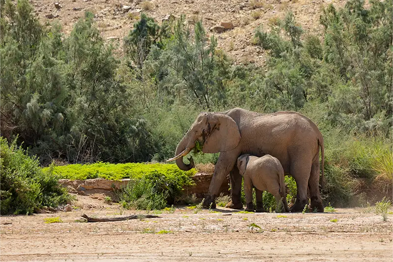 Heute werden wir eine ganze Weile entlang des Flussbetts des Hoanib fahren. Diese Flussläufe sind eine Lebensader in der Wüste und versorgen die hier lebenden Tiere mit Nahrung und Wasser. Zu den häufigsten Tierarten gehören Wüstenelefanten, Giraffen, Großkatzen wie Löwen, Leoparden und Geparden sowie verschiedene Antilopenarten wie Oryx, Kudu und Springbock. Zebras und Strauße sind hier ebenfalls oft anzutreffen.