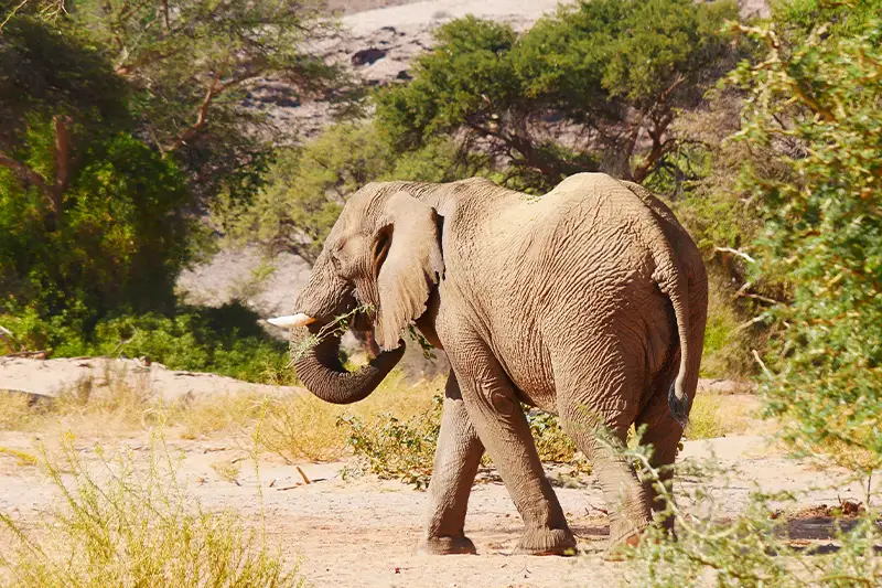Nach einer erholsamen Nacht in unseren Zelten genießen wir ein herzhaftes Frühstück und beginnen damit, unseren Campingplatz abzubauen. Die Tour setzt sich in nördlicher Richtung fort. Wir fahren durch das Flussbett des Huab Flusses, wo man oft Wüstenelefanten beobachten kann. Man muss jedoch sehr aufmerksam sein, da die großen Säugetiere sich hinter Sträuchern und Büschen verstecken können. Diese majestätischen Tiere sollten immer aus sicherer Distanz beobachtet werden.