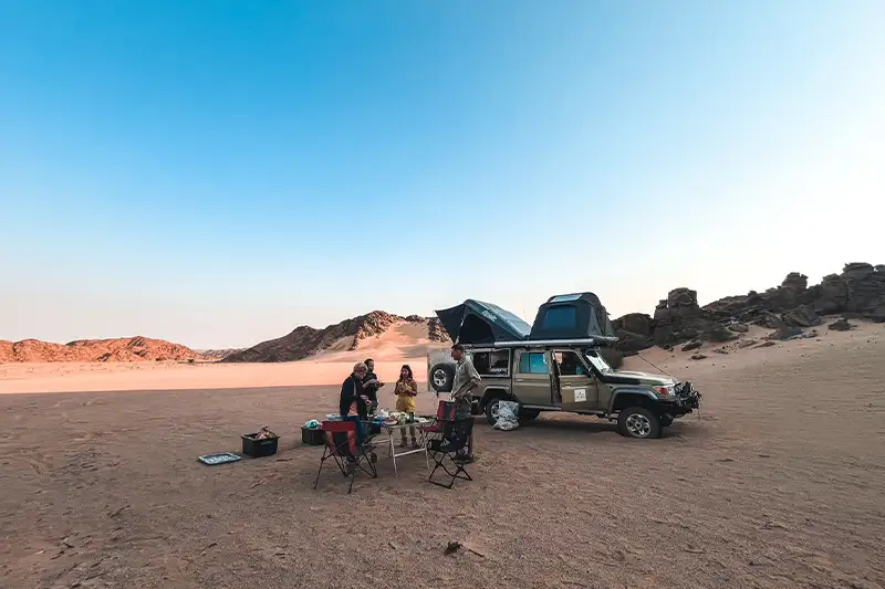 Dann setzen wir unsere Fahrt fort durch wunderschöne Flächen und Trockenflüsse, wo auch Wüstentiere zu sehen sind. Wir verbringen eine weitere Nacht in der menschenleeren Wildnis und genießen die Freiheit unseres wunderschönen wilden Camps.