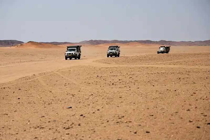 Heute werden wir hauptsächlich auf sandigem Untergrund unterwegs sein, da wir den Tag in verschiedenen Trockenflüssen verbringen werden. Nachdem wir den Khumib Fluss durchquert haben, folgen wir dem malerischen Flusslauf des Hoarusib Trockenflusses. Sobald wir auch diesen passiert haben, fahren wir durch karge Wüstenlandschaften bis zu den Ufern des Hoanib Flusses.