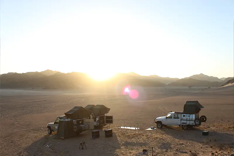 Unser schönes wildes Camp liegt in der Nähe des massiven Brandbergs. Ein Hügel aus großen Granitkugeln bietet Schutz vor dem Südwest Wind, der hier am Nachmittag oft weht. Genießen Sie das tolle Panorama über die kargen Wüstenflächen mit Blick auf den höchsten Berg Namibias. Unser wildes Buschlager wird eine mobile Dusche und eine Buschtoilette haben. Wir werden auf den Autos in den Dachzelten schlafen und eine perfekte Nacht unter den Sternen genießen – ohne künstliche Lichter, welche die Sicht auf den Sternenhimmel verderben. Das Abendessen wird am Lagerfeuer gekocht. Gemeinsam werden wir um das Lagerfeuer sitzen und die Ruhe der Wüste genießen.