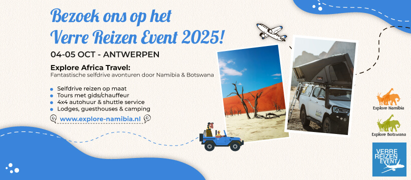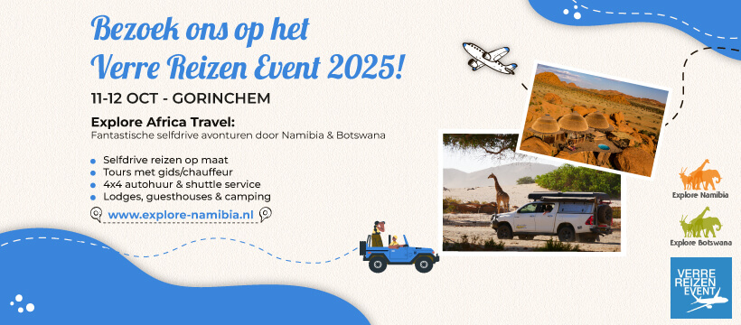 Explore Namibia wird auf der Verre Reizen Event Gorinchem, 11-12 Oktober 2025, Next Level, Gorinchem vertreten sein. Alle, die an einem Selbstfahrabenteuer oder einer privaten geführten Tour in Namibia und/oder Botswana interessiert sind, sind herzlich eingeladen, unseren Stand zu besuchen und ihre persönlichen Reisepläne mit einem unserer Reiseexperten zu besprechen.