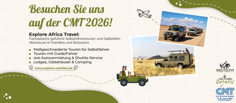 Explore Namibia wird auf der CMT Die Urlaubsmesse, 17-25 Januar 2026, Stuttgart. vertreten sein. Alle, die an einem Selbstfahrabenteuer oder einer privaten geführten Tour in Namibia und/oder Botswana interessiert sind, sind herzlich eingeladen, unseren Stand zu besuchen und ihre persönlichen Reisepläne mit einem unserer Reiseexperten zu besprechen.