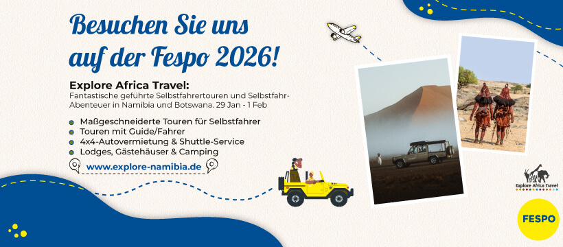 Explore Namibia wird auf der FESPO und Golfmesse from 30 jan – 2 Februar, Zürich vertreten sein. Alle, die an einem Selbstfahrabenteuer oder einer privaten geführten Tour in Namibia und/oder Botswana interessiert sind, sind herzlich eingeladen, unseren Stand zu besuchen und ihre persönlichen Reisepläne mit einem unserer Reiseexperten zu besprechen.