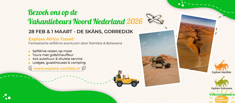 Explore Namibia wird auf der Vakantiebeurs Noord Nederland, 28 Februar – 1 März 2026, Gorredijk vertreten sein. Alle, die an einem Selbstfahrabenteuer oder einer privaten geführten Tour in Namibia und/oder Botswana interessiert sind, sind herzlich eingeladen, unseren Stand zu besuchen und ihre persönlichen Reisepläne mit einem unserer Reiseexperten zu besprechen.