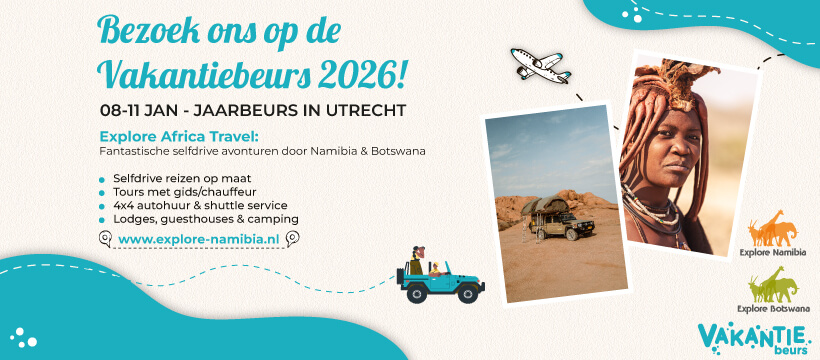 Explore Namibia wird auf der Vakantiebeurs Utrecht, 8-11 Januar 2026, Jaarbeurs, Utrecht vertreten sein. Alle, die an einem Selbstfahrabenteuer oder einer privaten geführten Tour in Namibia und/oder Botswana interessiert sind, sind herzlich eingeladen, unseren Stand zu besuchen und ihre persönlichen Reisepläne mit einem unserer Reiseexperten zu besprechen.